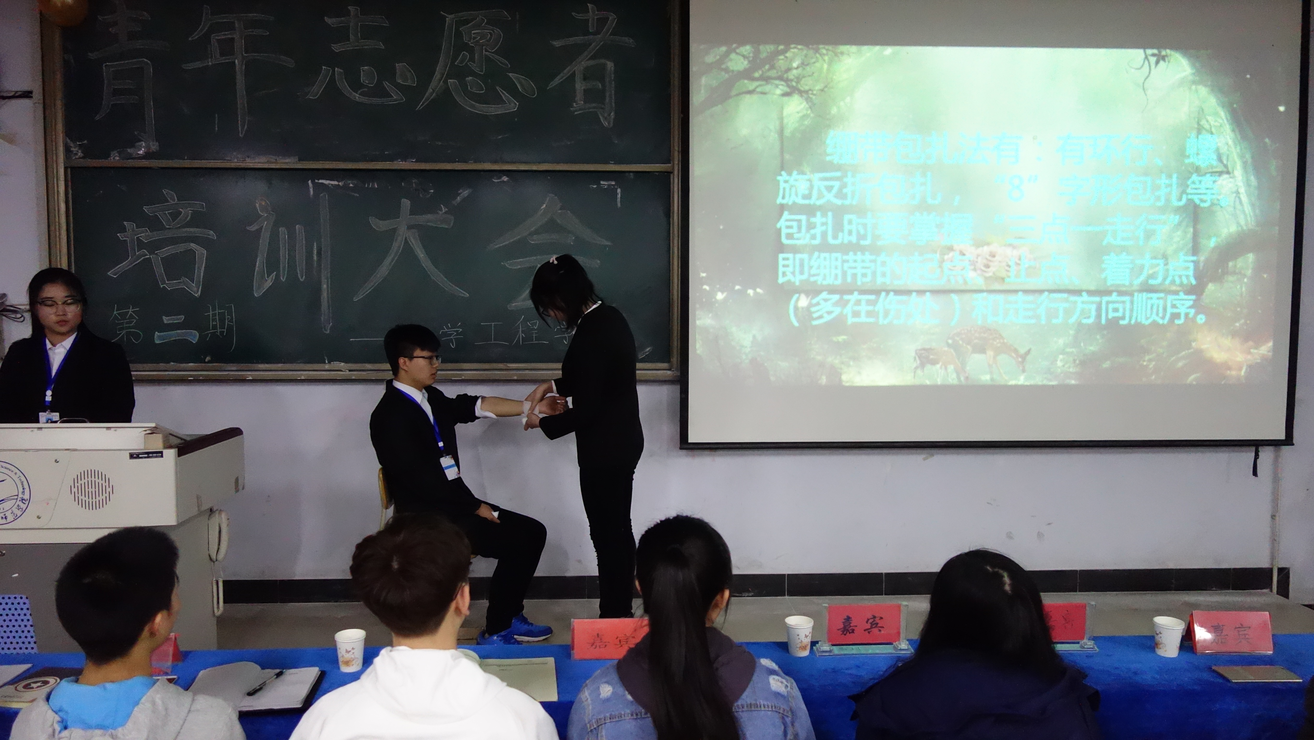 首先,同学们回顾了上学期大会内容。然后为大家讲解并展示了当发生有人心脏骤停、溺水和骨折等突发的意外情况时,应如何采取急救措施以及正确的伤口包扎方法。培训设置了有奖问答环节,充分调动了同学们的参与的热情,同学们在娱乐中丰富了急救知识,受益颇深。